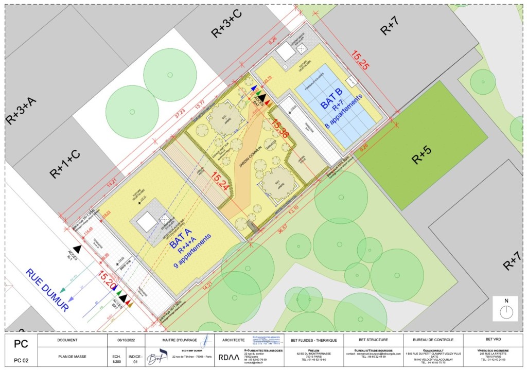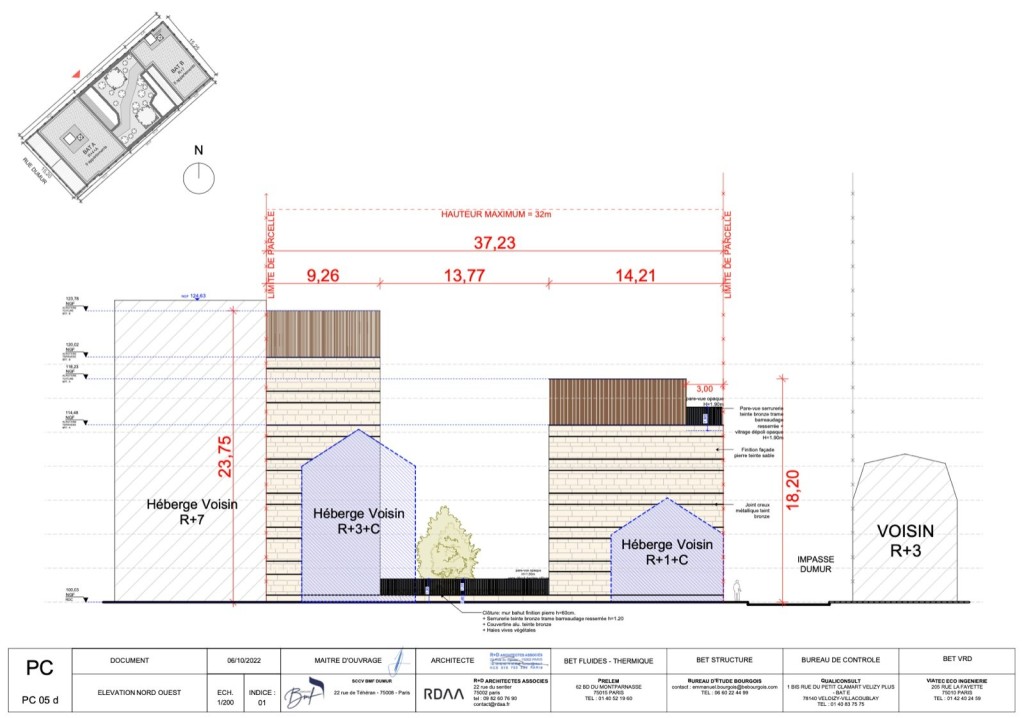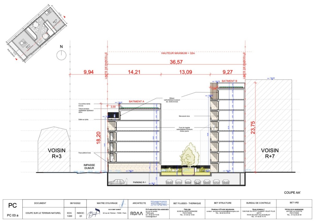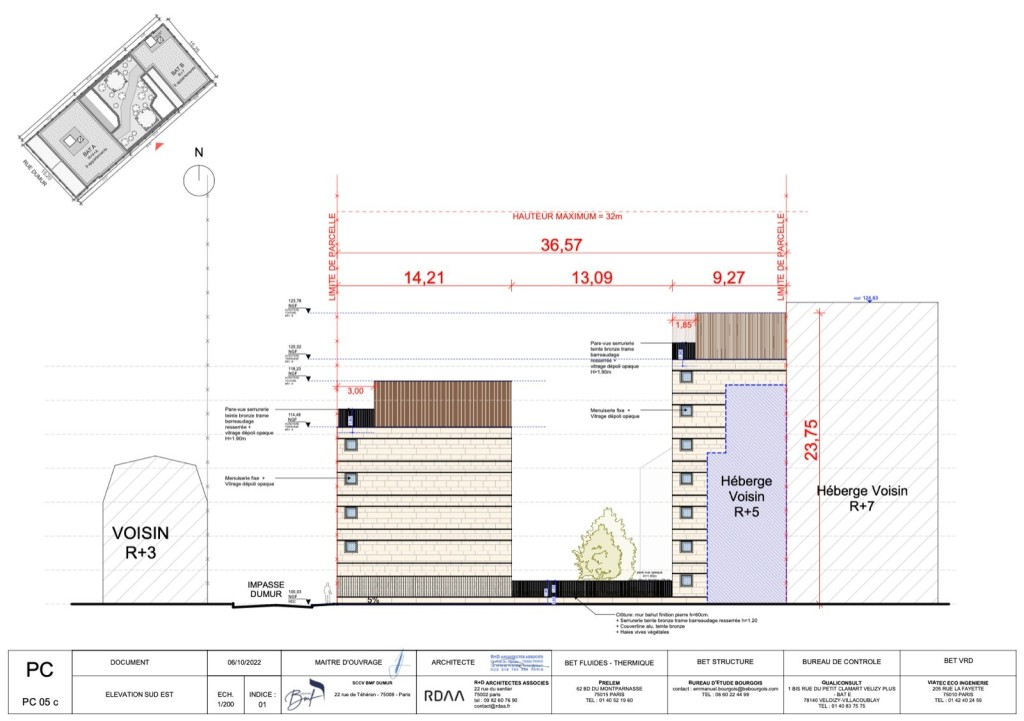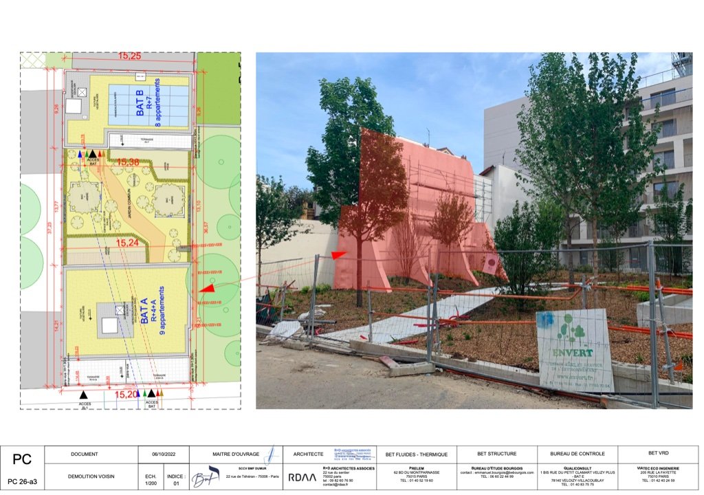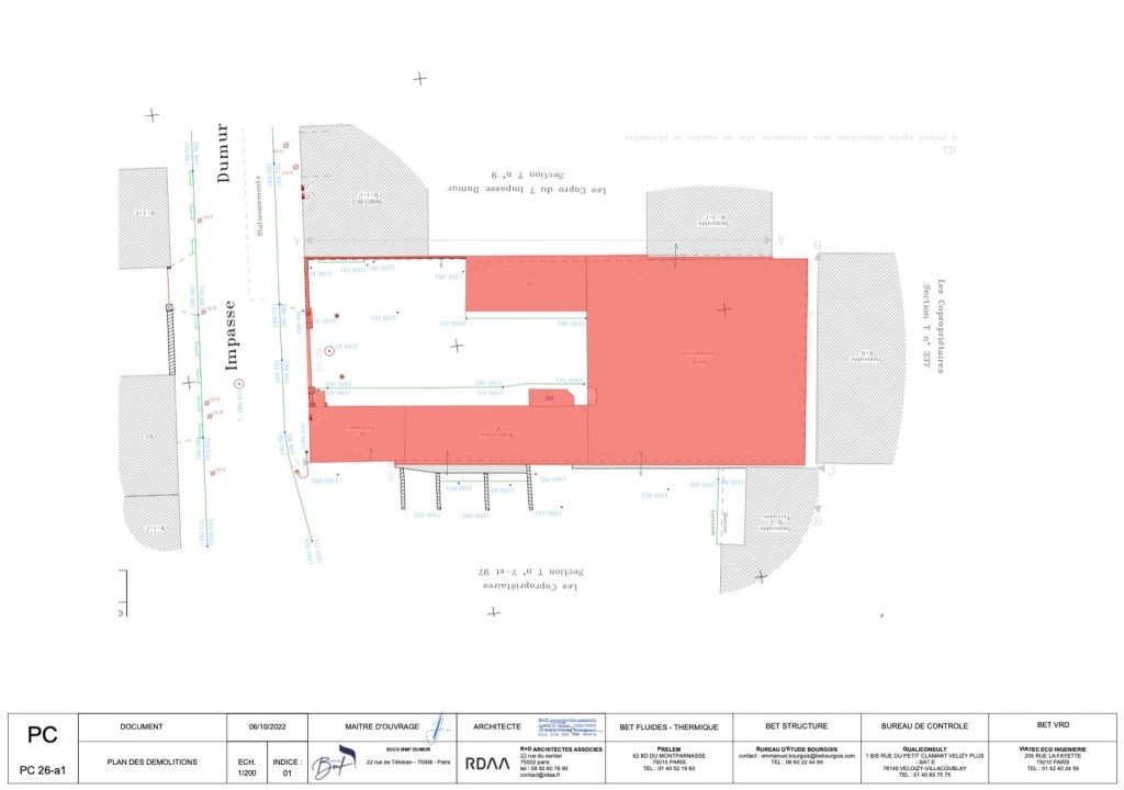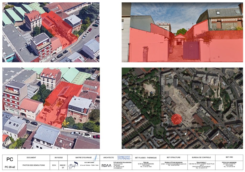 PC purgé situé au 9 impasse dumur sur la commune de Clichy. Le projet a pour but de réaliser 2 bâtiments l’un de 7 étages et l’autre de 4 étages pour 1495 m2 de SDP ( 1357,21 m2 SHAB ). 277,88 m2 d’espaces extérieurs qui comprennent des jardins, loggias et terrasses.