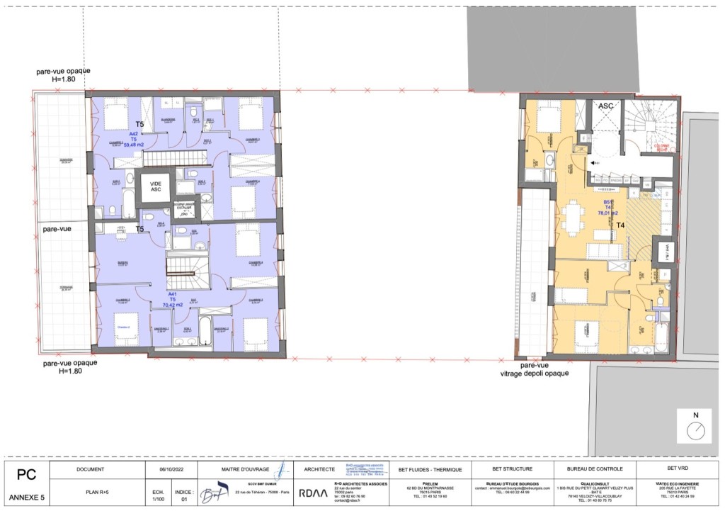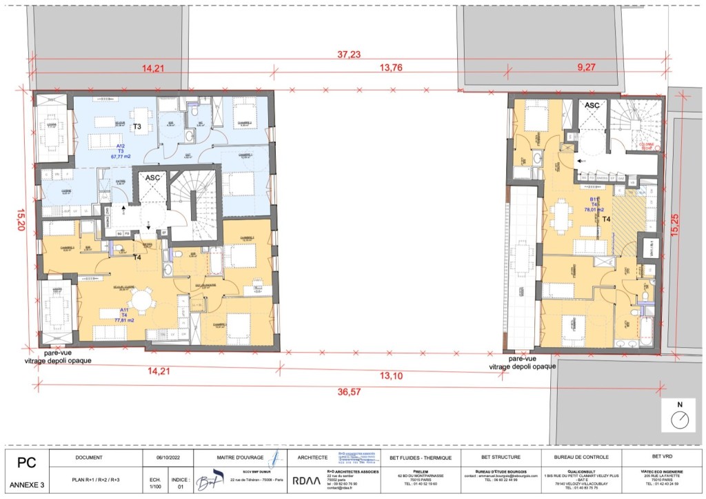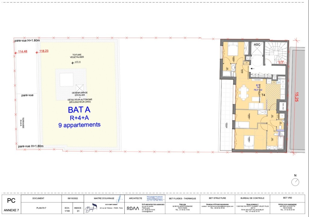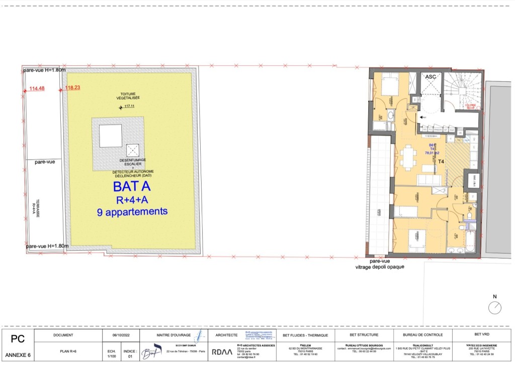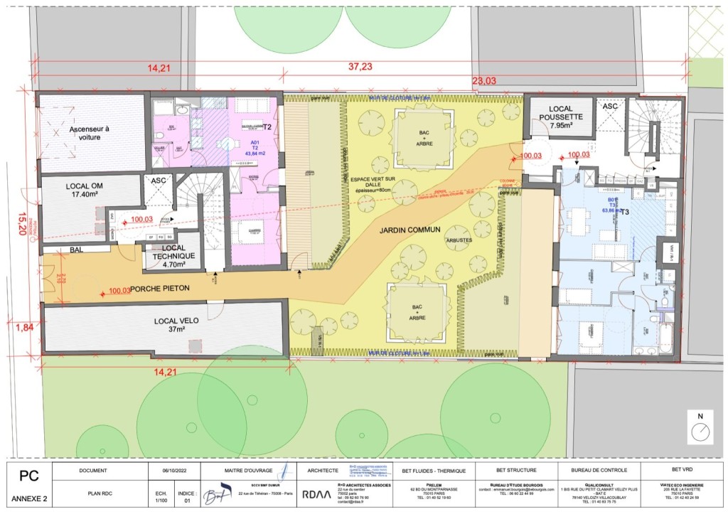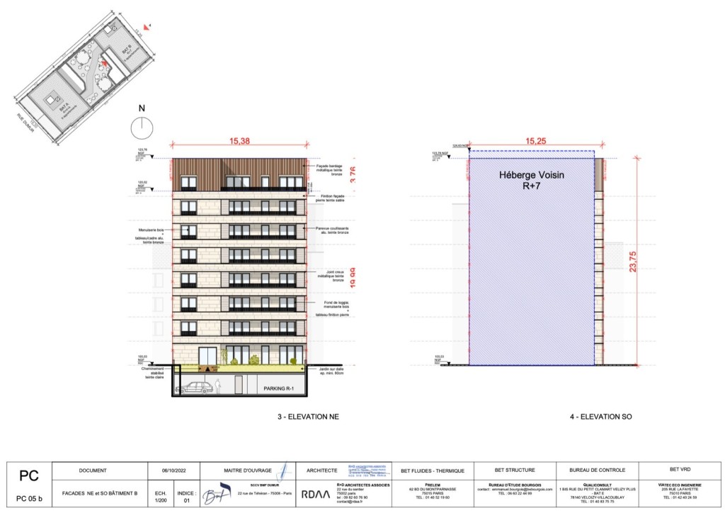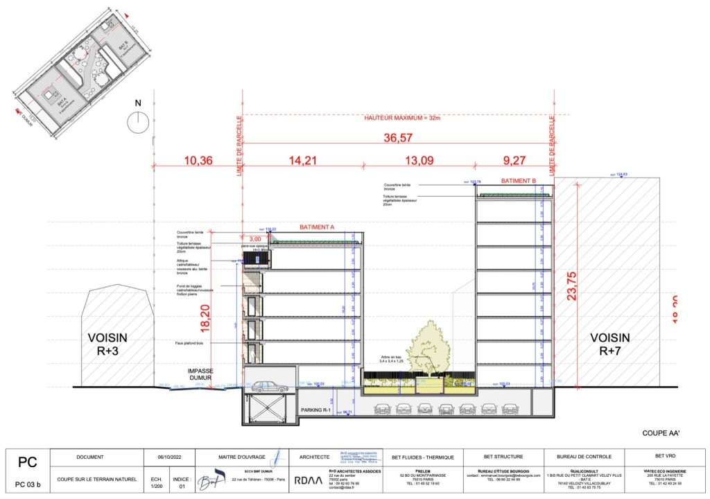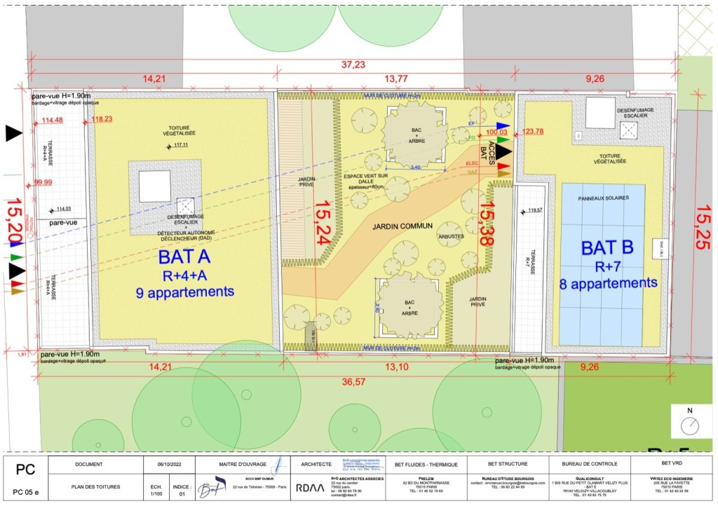 PC purgé situé au 9 impasse dumur sur la commune de Clichy. Le projet a pour but de réaliser 2 bâtiments l’un de 7 étages et l’autre de 4 étages pour 1495 m2 de SDP ( 1357,21 m2 SHAB ). 277,88 m2 d’espaces extérieurs qui comprennent des jardins, loggias et terrasses.
